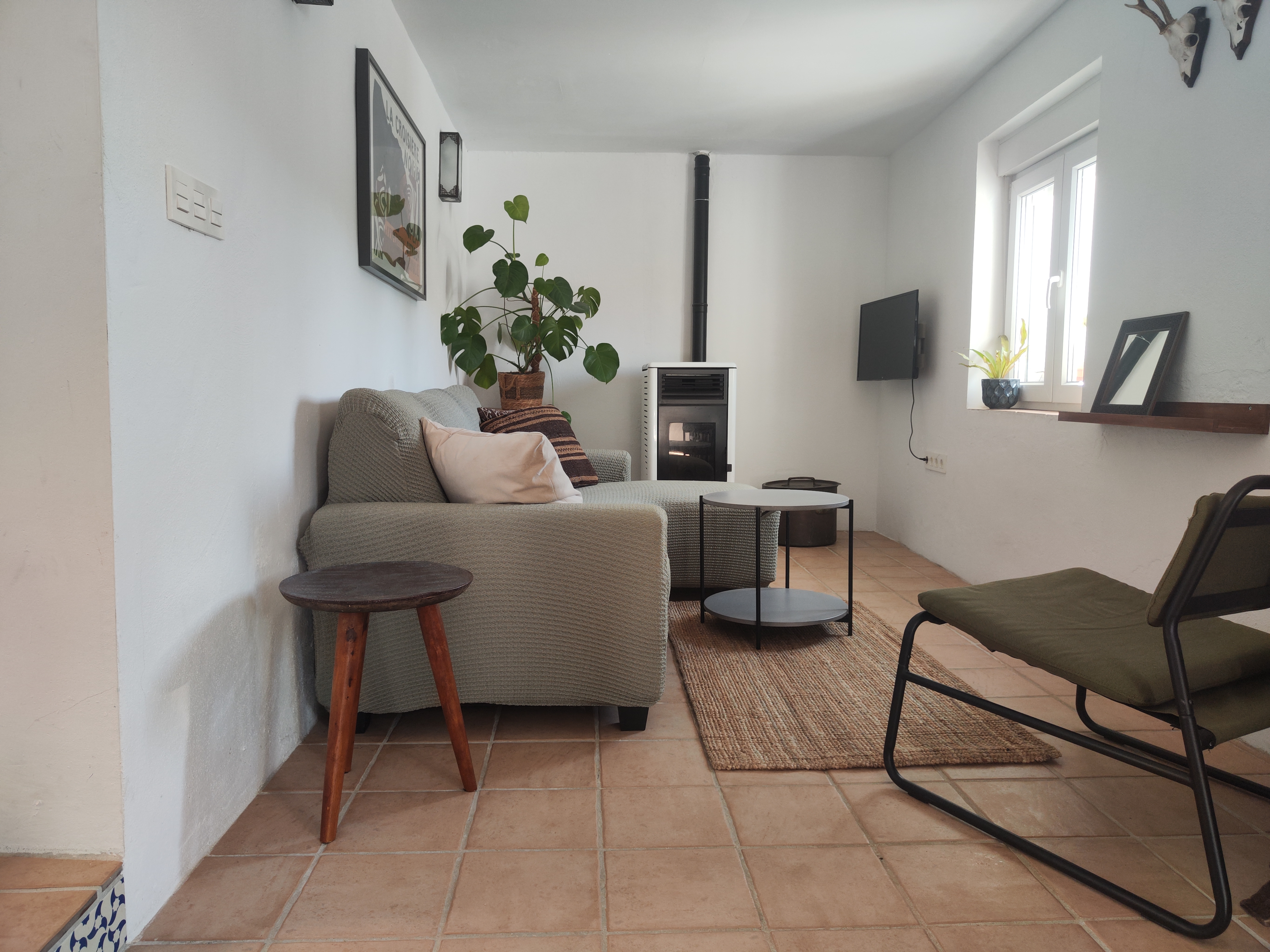Lichte, sfeervolle woon- eetkamer met Andalusische details, een gezellige pellet kachel voor de koudere winteravonden en een Android Smart TV om de eigen TV App te installeren of te casten.
